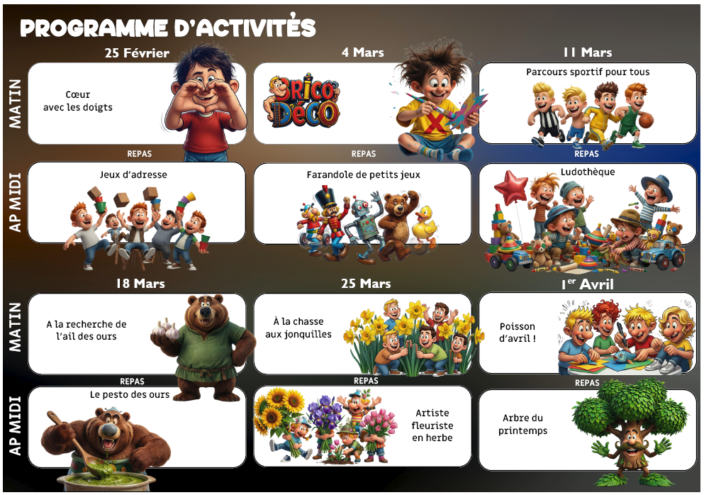 Pour la période de février, mars et avril, l’équipe d’animation propose un programme varié autour du printemps : activités nature (chasse aux jonquilles, découverte de l’ail des ours), ateliers créatifs, jeux collectifs, parcours sportifs et sortie , la ludothèque. Des temps ludiques et éducatifs pensés pour favoriser le plaisir, la découverte et le vivre-ensemble.